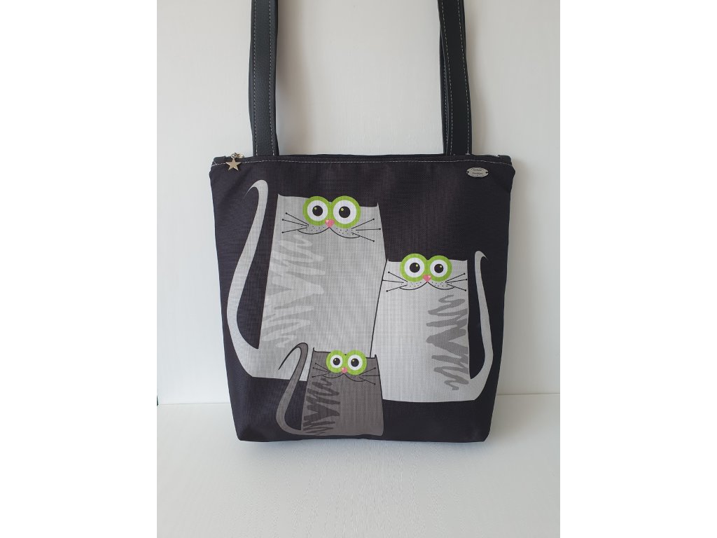 Přední díl kabelky je z panelu kočárkoviny. Zadní díl je z koženky.