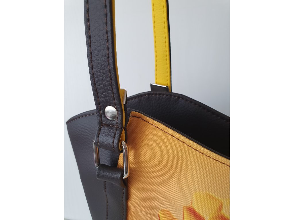 Originální obrázek, který jinde nenajdete. Je totiž můj. Kabelka má ušitý velice efektivní dvoubarevný popruh. Barvy k sobě perfektně ladí.