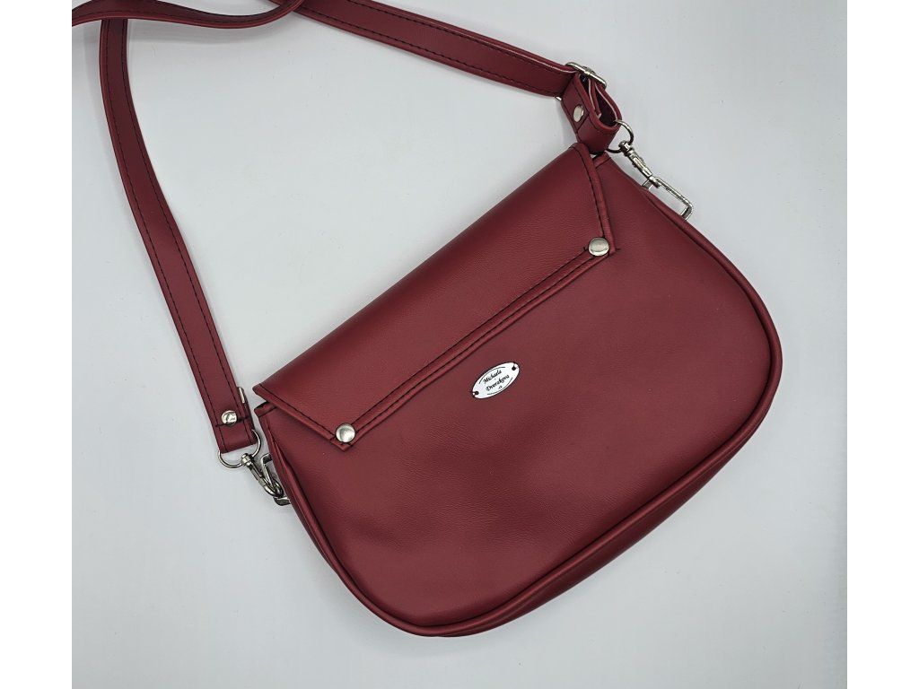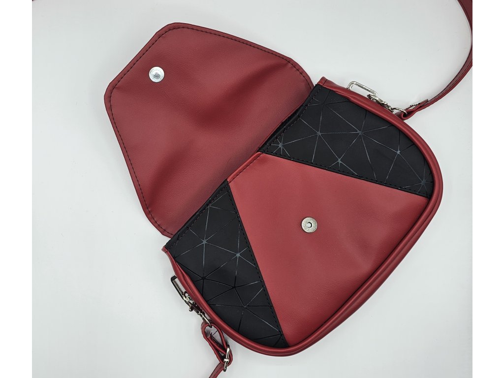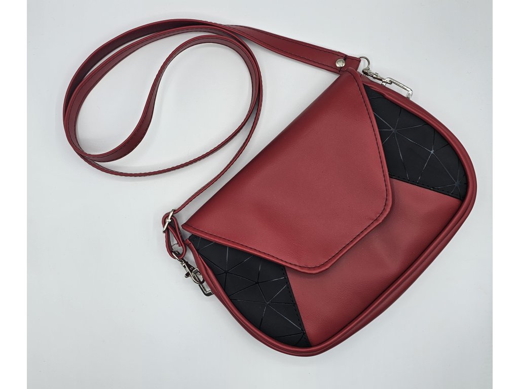Klopa je z koženky na magnetické zapínání. Přední díl je z designové matné černé koženky s lesklými proužky v kombinaci s tmavě červenou koženkou. Popruhy jsou široké 2 cm a dlouhé cca 130 cm a upevněné ke kabelce designovým uchycením a karabinami.